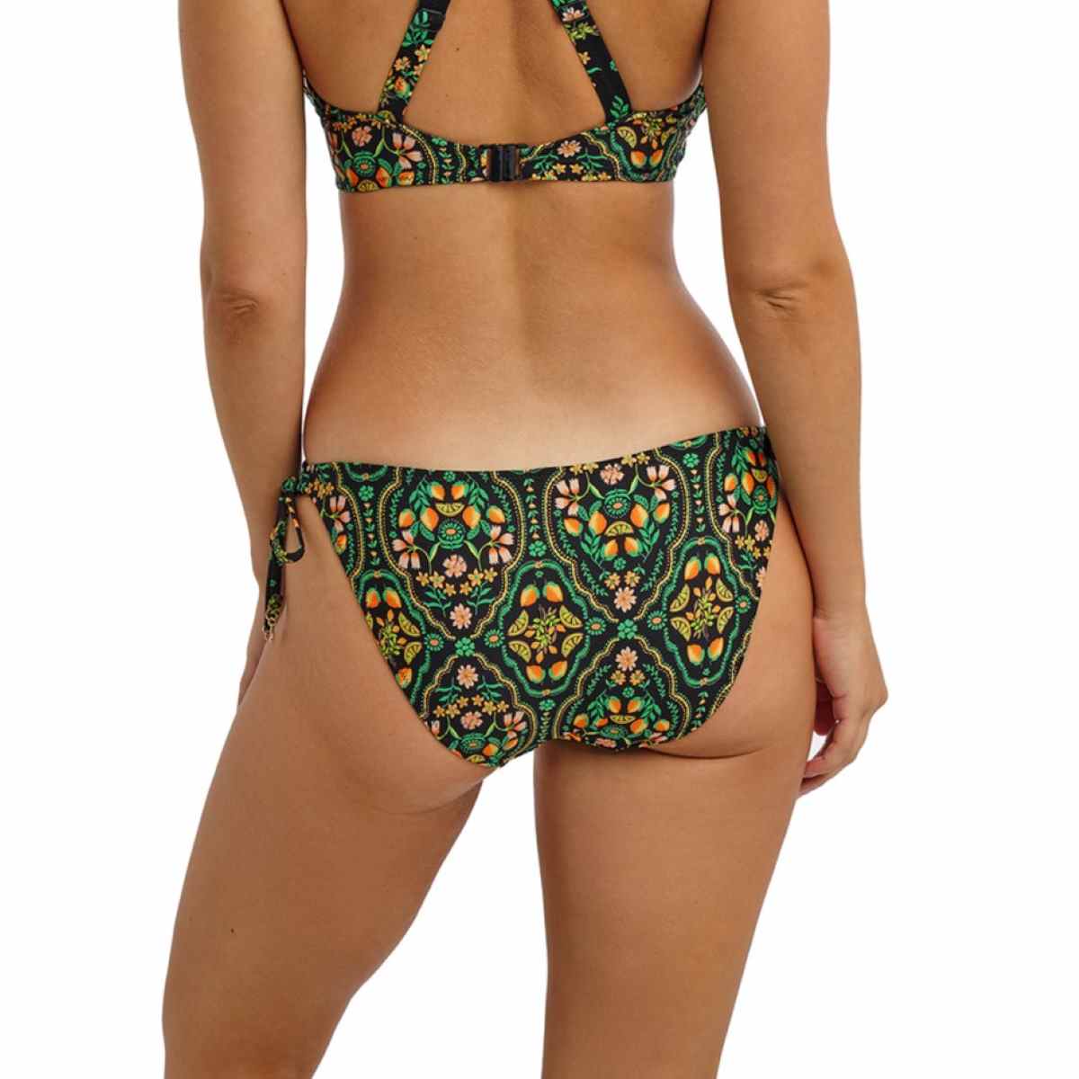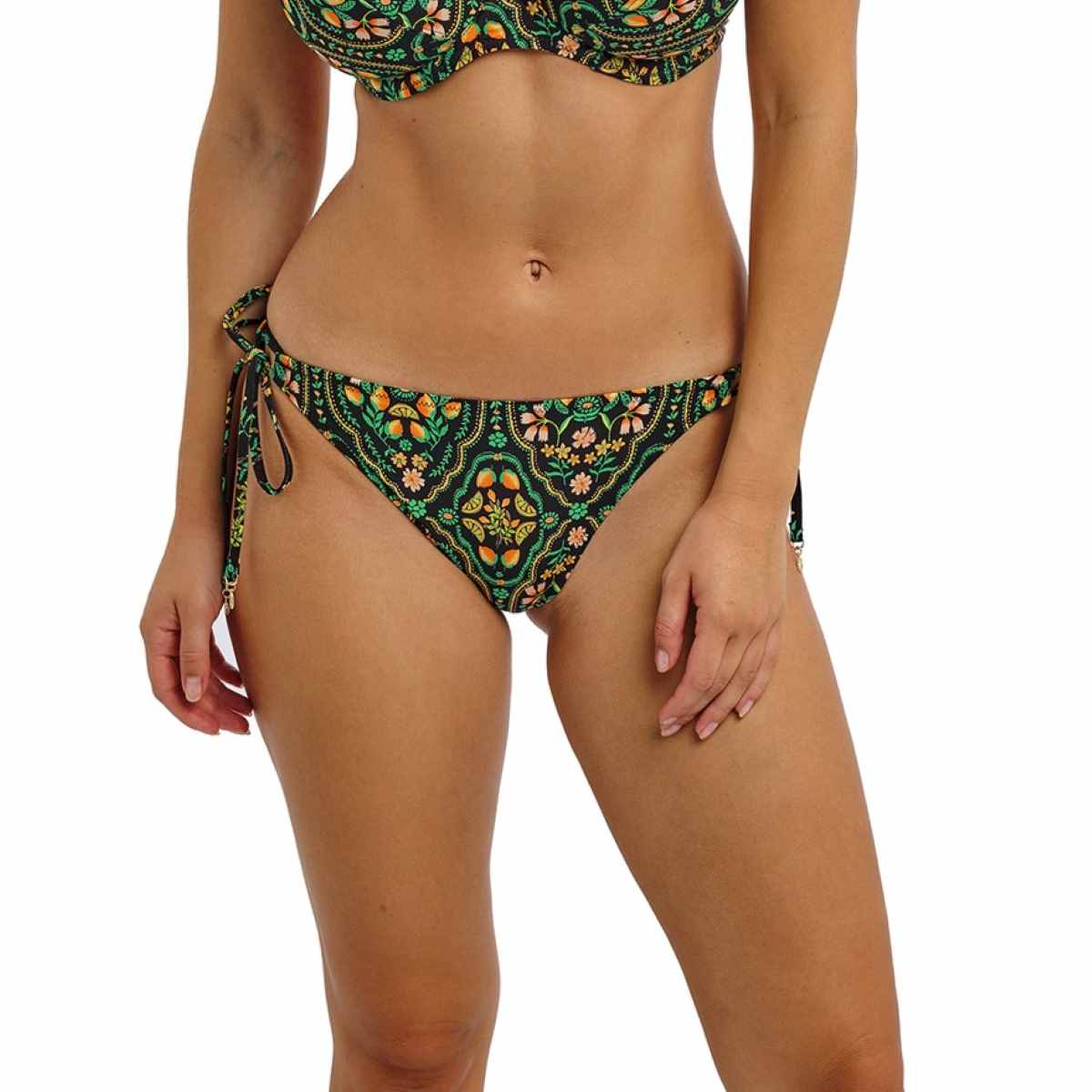 Soak up the sun and make the most of your summer days in Sunset In Seville, Freya’s vibrant new print for the season. Inspired by sun-kissed citrus groves and traditional Andalusian tiles, this collection blends jade, zesty tones, and golden hues on a bold black background, with select styles featuring a luxurious gold leaf trim. Designed for a flattering, adjustable fit, this bikini brief sits low on the hips, features narrow adjustable sides, offers medium bottom coverage, and is finished with elegant gold leaf trim details on the tie ends.