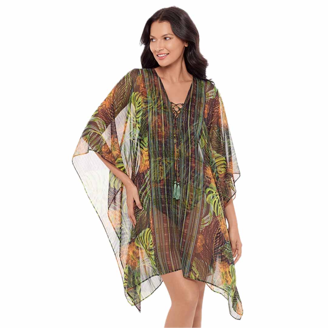 An effortlessly chic, Sunset Islet Sheer Chiffon Caftan Beach Cover Up in an easy one-size fit, featuring a lace-up tasselled neckline and subtle lurex shimmer for a touch of luxe glamour.