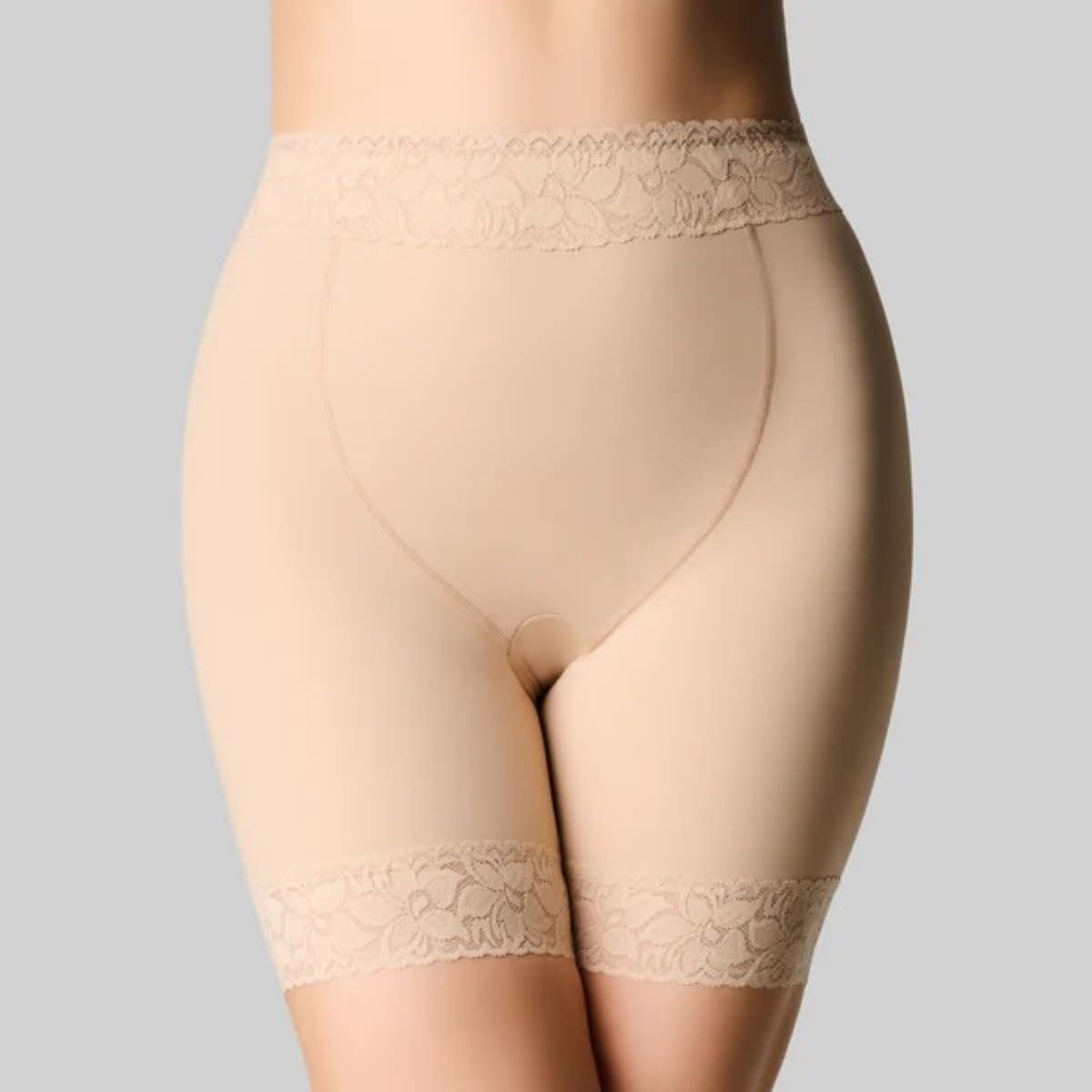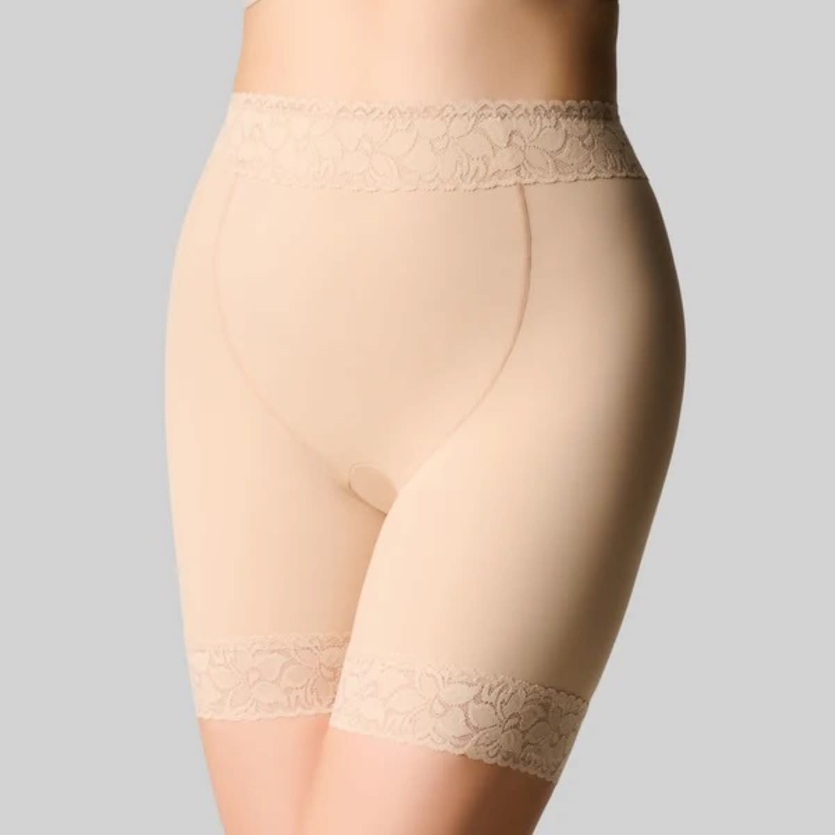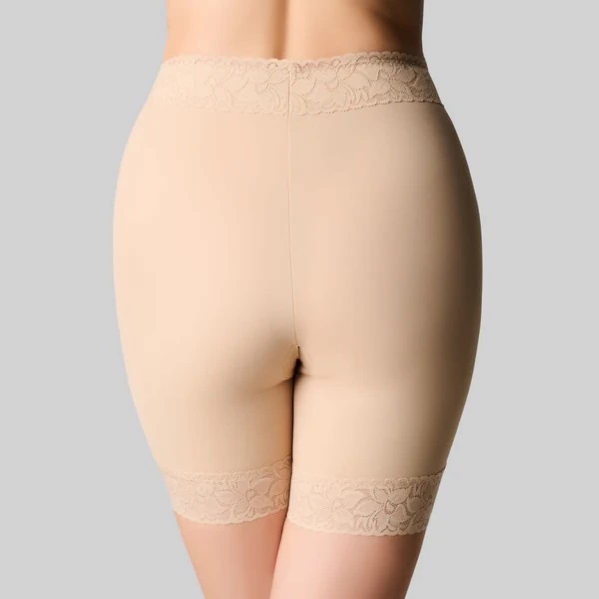 Our Anti Chaffing Short is designed to prevent thigh chaffing and also shapes the figure. It sits high to the waist with a tummy support panel. Ideal for those who have had tummy surgery, C. sections or just need a little more support and not a full control garment. The leg line sits mid-thigh. It is made from a silky stretch fabric for a comfort fit and smoothing.
