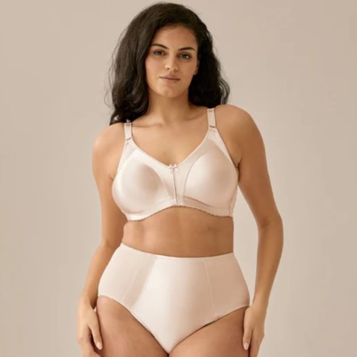This minimiser bra by Naturana is crafted from beautiful glossy satin fabrics. It features non-wired, seamless cups with supporting side and breast panels. Adjustable straps and double-row, 3-position hook-and-eye back closure complete the look and provide ultimate comfort. It completely covers your bust giving nice support. Main fabrics: 90% Polyamide 10% Elastane.